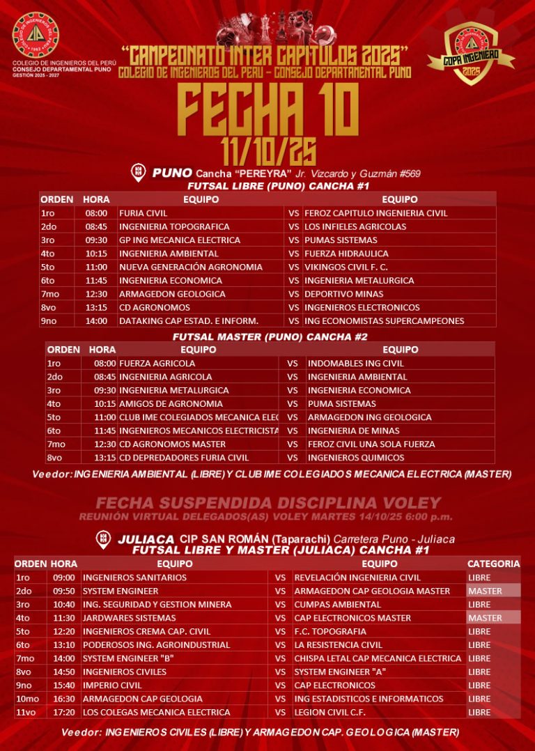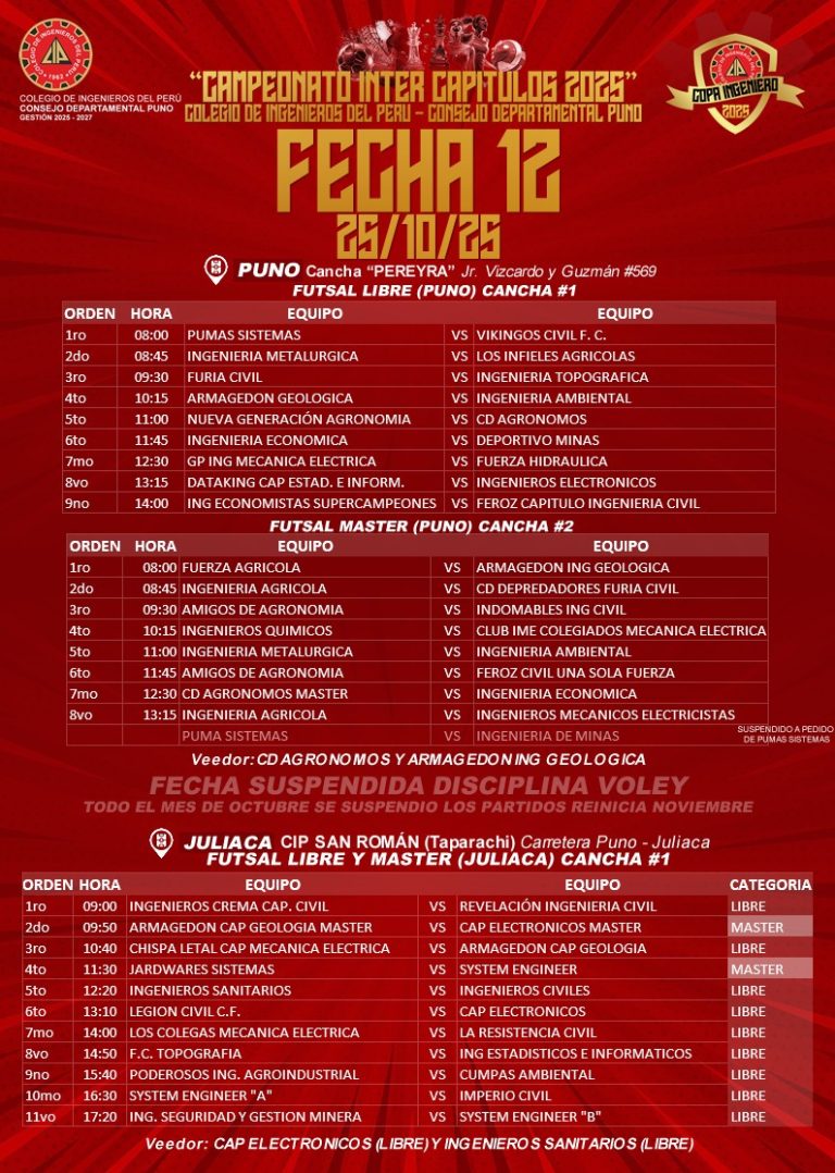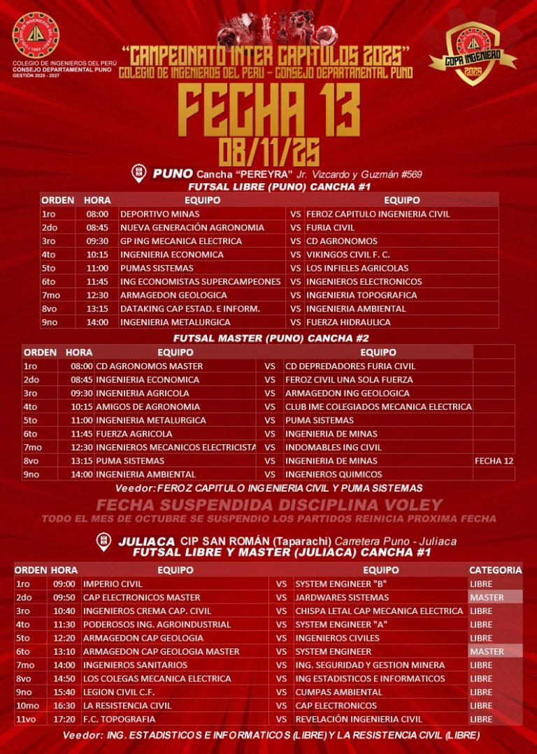 22 noviembre 2025 FIXTURE FECHA 15 COPA INGENIERO 2025 22 noviembre 2025 15 noviembre 2025 FIXTURE FECHA 14 COPA INGENIERO 2025 15 noviembre 2025 08 noviembre 2025 FIXTURE FECHA 13 COPA INGENIERO 2025 08 noviembre 2025 25 octubre 2025 FIXTURE FECHA 12 COPA INGENIERO 2025 25 octubre 2025 18 octubre 2025 FIXTURE FECHA 11 COPA INGENIERO 2025 18 octubre 2025 11 octubre 2025 FIXTURE FECHA 10 COPA INGENIERO 2025 11 octubre 2025
