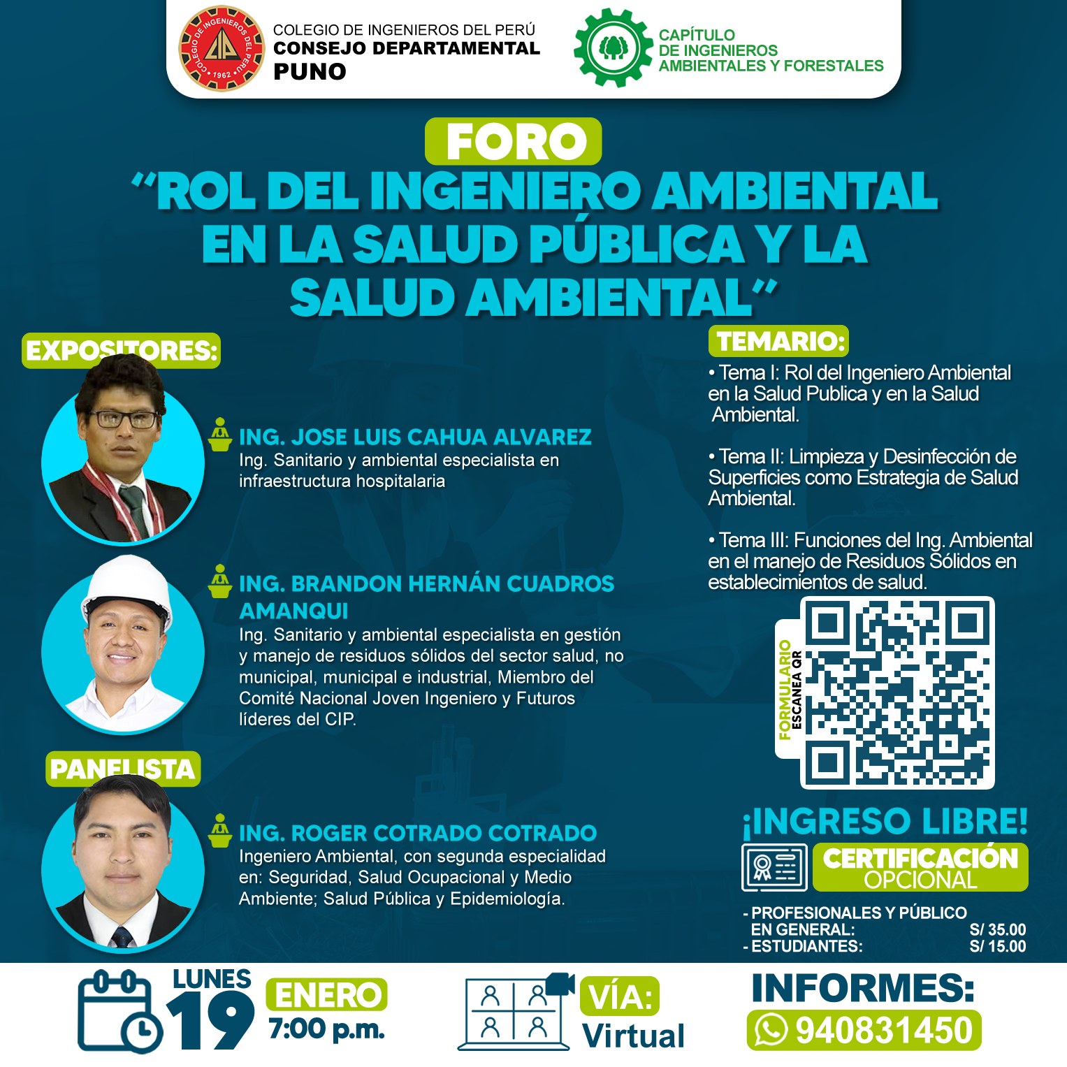 🌱👷♂️ FORO VIRTUAL 👷♀️🌱 📢 ROL DEL INGENIERO AMBIENTAL EN LA SALUD PÚBLICA Y LA SALUD AMBIENTAL El Colegio de Ingenieros del Perú – Consejo Departamental Puno, a través del Capítulo de Ingenieros Ambientales y Forestales, te invita a participar en este importante foro donde se abordará el papel fundamental del ingeniero ambiental en la protección de la salud pública y el cuidado del medio ambiente 🌍💚.